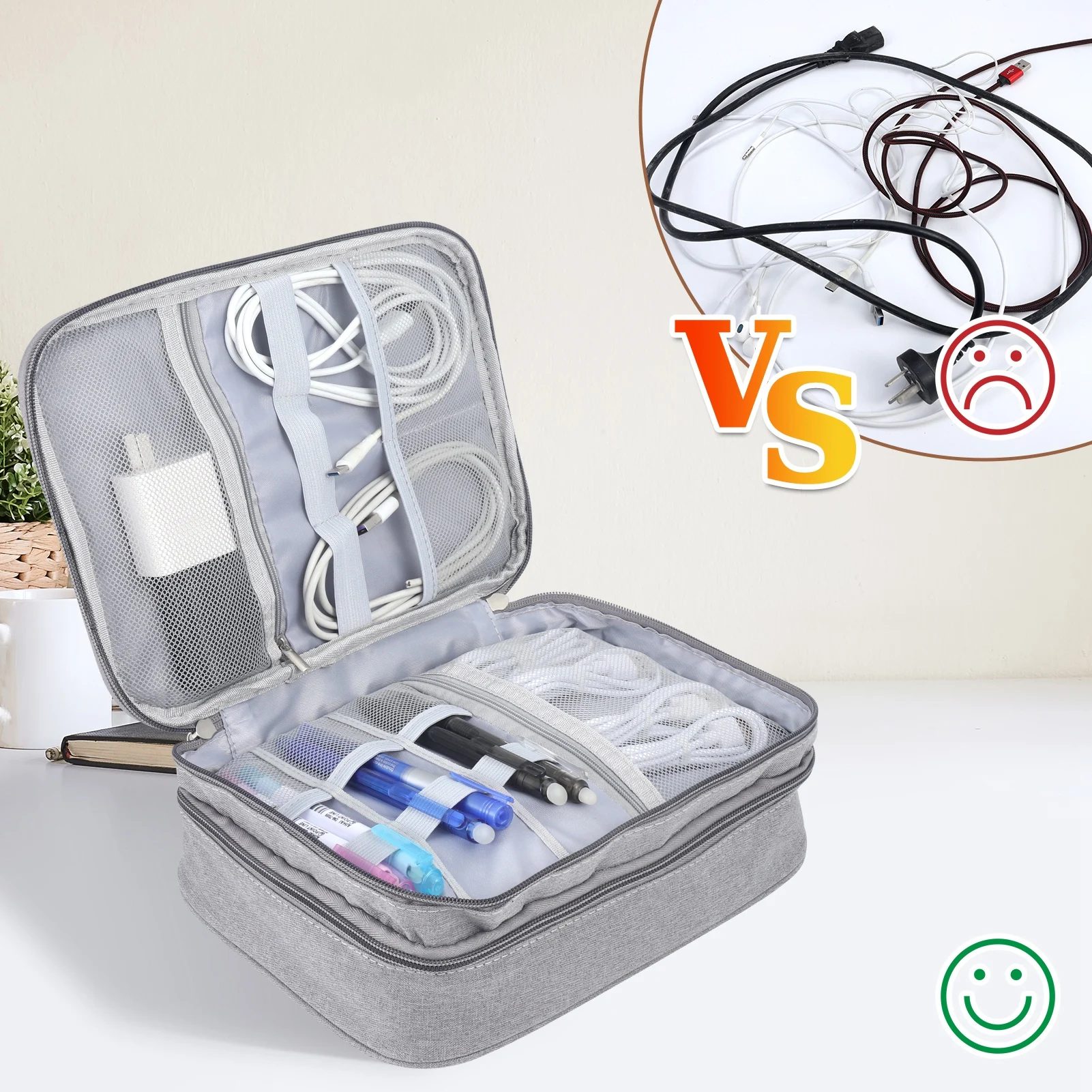 DOUBLE LAYERS & WELL ORGANIZED - This travel electronics organizer is designed with multiple pockets and various size of elastic bands providing great flexibility for organizing electronics accessories such as USB Cable Cord, Flash Drive, Wall Charger, SD Card, Hard Drive, Power Bank, Earbuds, Camera.